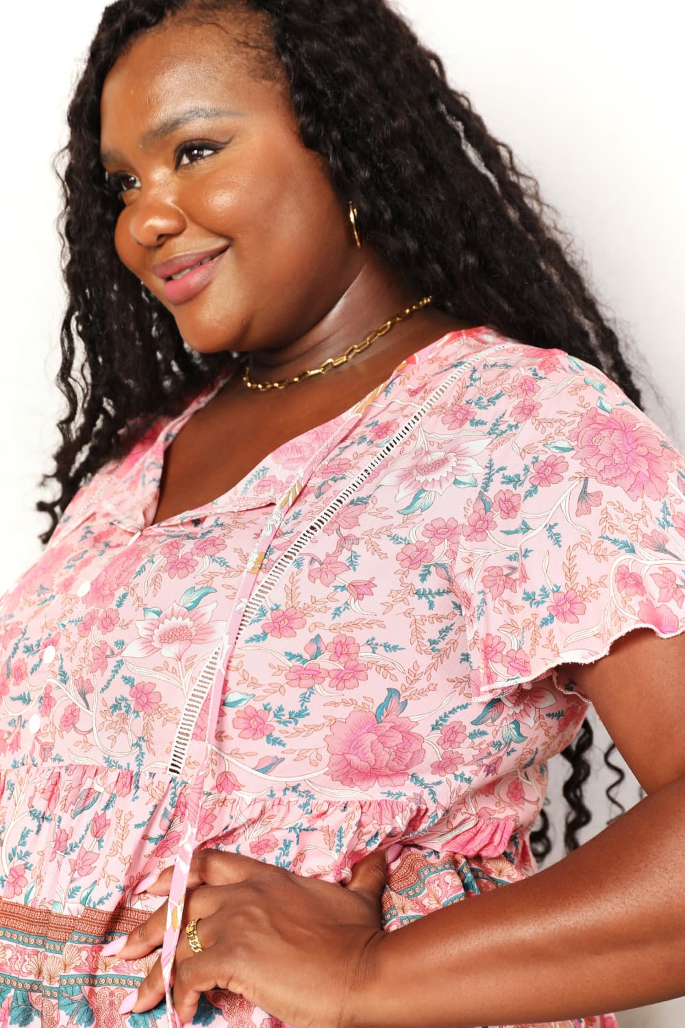 This blouse features a tie-neck design and decorative buttons, adding a touch of boho charm. The peplum detail adds a feminine and flattering silhouette to the blouse. With its floral pattern, it exudes a romantic and free-spirited vibe. The short flutter sleeves add a delicate and playful touch. This tie-neck peplum blouse is perfect for channeling your inner boho chic style and creating effortlessly stylish outfits.