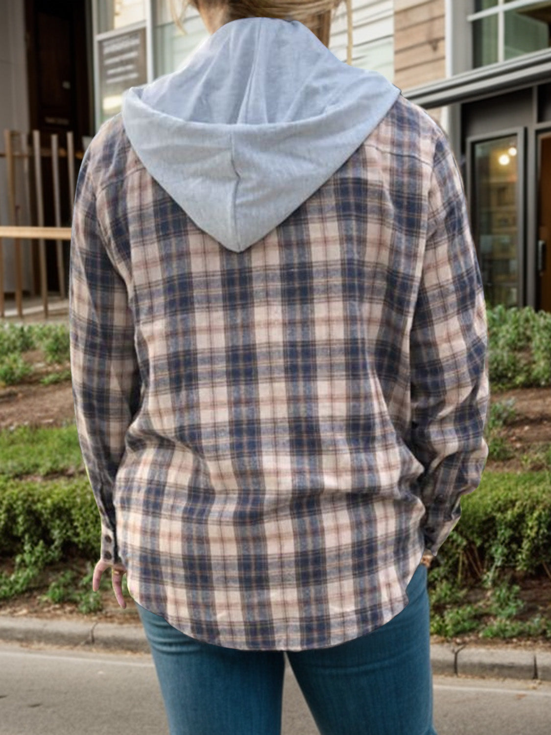 Plus Size Plaid Button Up Long Sleeve Hooded Jacket